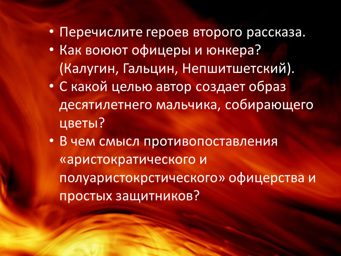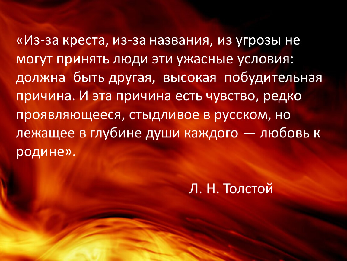 «Из-за креста, из-за названия, из угрозы не могут принять люди эти ужасные условия: должна быть другая, высокая побудительная причина. И эта причина есть чувство, редко проявляющееся, стыдливое в русском, но лежащее в глубине души каждого — любовь к родине».