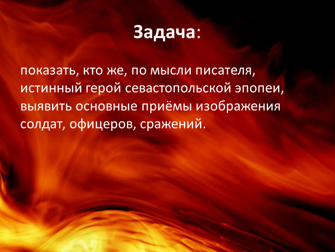 показать, кто же, по мысли писателя, истинный герой севастопольской эпопеи, выявить основные приёмы изображения солдат, офицеров, сражений.