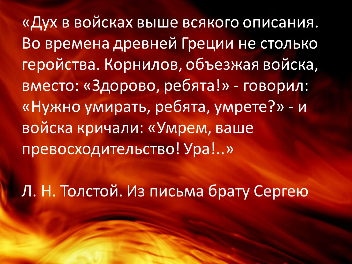 «Дух в войсках выше всякого описания. Во времена древней Греции не столько геройства. Корнилов, объезжая войска, вместо: «Здорово, ребята!» - говорил: «Нужно умирать, ребята, умрете?» - и войска кричали: «Умрем, ваше превосходительство! Ура!..»
