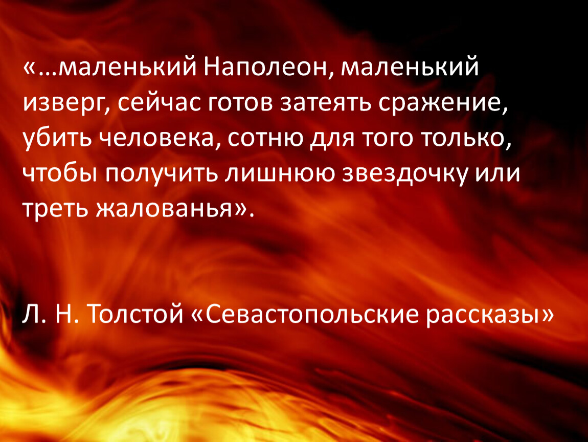 «…маленький Наполеон, маленький изверг, сейчас готов затеять сражение, убить человека, сотню для того только, чтобы получить лишнюю звездочку или треть жалованья».
