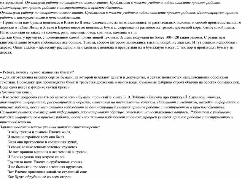 Организует работу по открытию нового знания. Предлагает в тексте учебника найти описание приемов работы. Демонстрирует приемы работы с инструментами и приспособлениями. – Привычная нам бумага появилась в Китае во II веке. Сначала листы изготавливались из растительных волокон, и способ производства долго держали в тайне. Лишь в Х веке в Европе впервые появилась бумага, сваренная из размолотых тряпок, древесной коры, бамбуковой щепы. Изготавливали ее также из соломы, ржи, пшеницы, овса, крапивы, камыша и т. д. Делали бумагу вручную, с применением самой примитивной техники. За день получали не более 100–120 килограммов. С развитием книгопечатания бумаги требовалось все больше. Тряпья, сбором которого занимались тысячи людей, не хватало. И тут решили испробовать дерево. Опыт удался – древесину расщепили на отдельные волокна и превратили их в бумажную массу. С тех пор и производят бумагу из дерева.