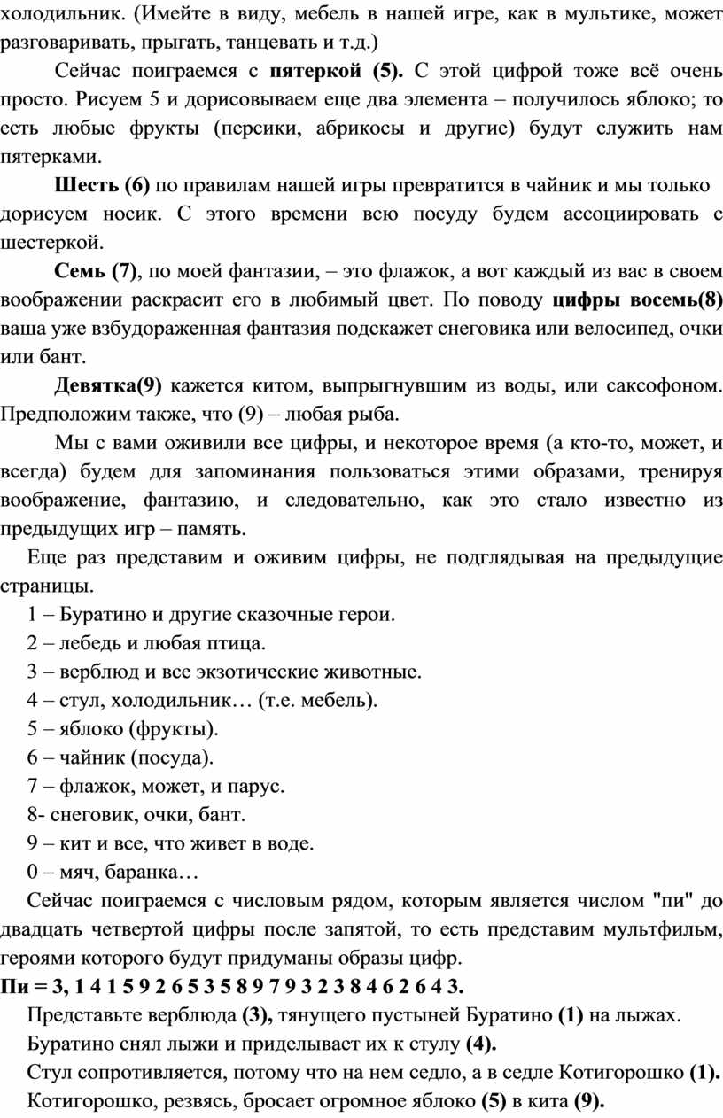Мы с вами оживили все цифры, и некоторое время (а кто-то, может, и всегда) будем для запоминания пользоваться этими образами, тренируя воображение, фантазию, и следовательно, как это стало известно из предыдущих игр – память.