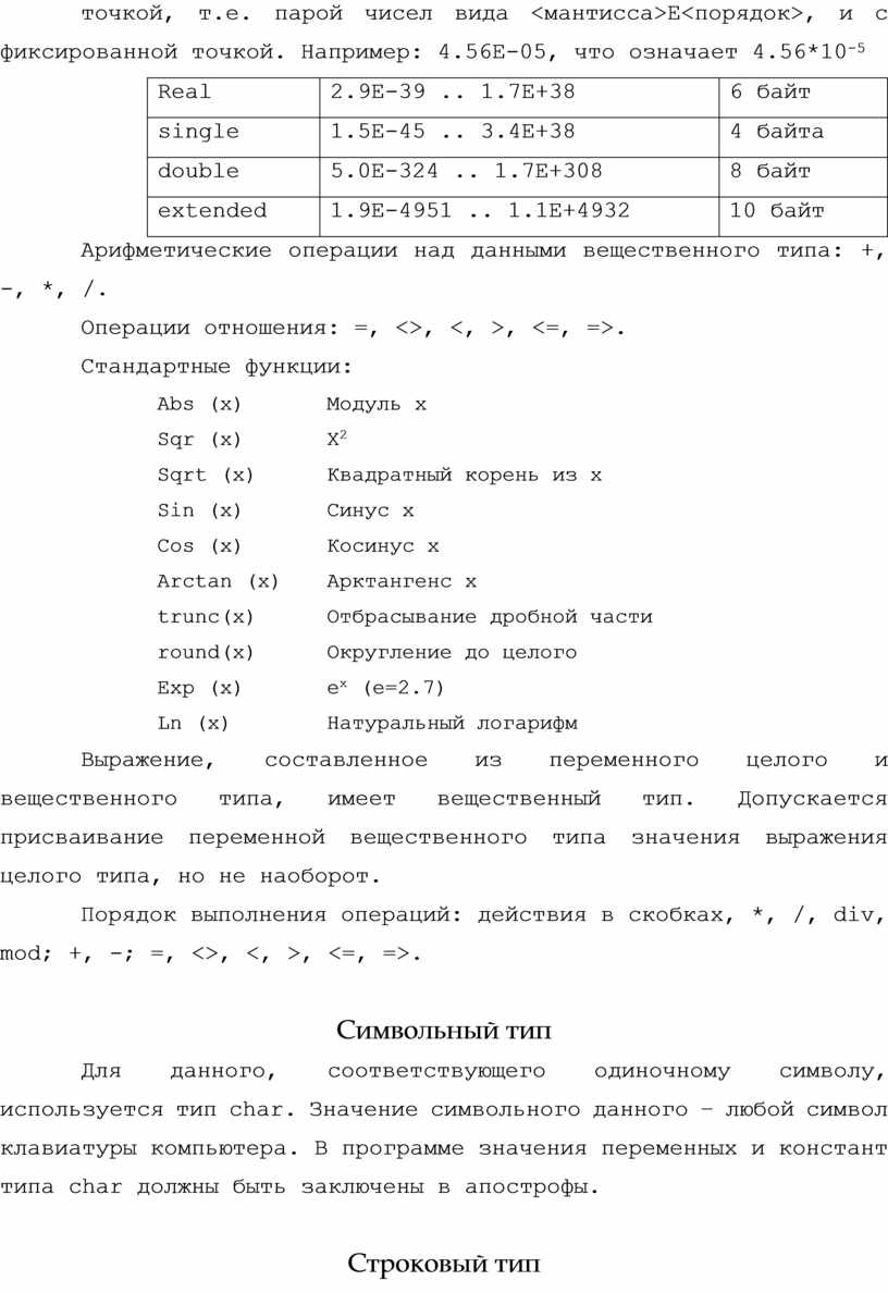 Для записи вещественных чисел вместо запятой используется точка. Вещественные значения изображаются в форме с плавающей точкой, т.е. парой чисел вида <мантисса>Е<порядок>, и с фиксированной точкой. Например: 4.56Е-05, что означает 4.56*10-5
