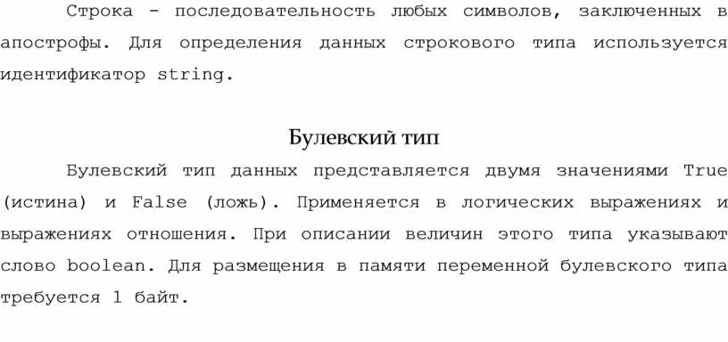 Булевский тип данных представляется двумя значениями True (истина) и False (ложь). Применяется в логических выражениях и выражениях отношения. При описании величин этого типа указывают слово boolean. Для размещения в памяти переменной булевского типа требуется 1 байт.