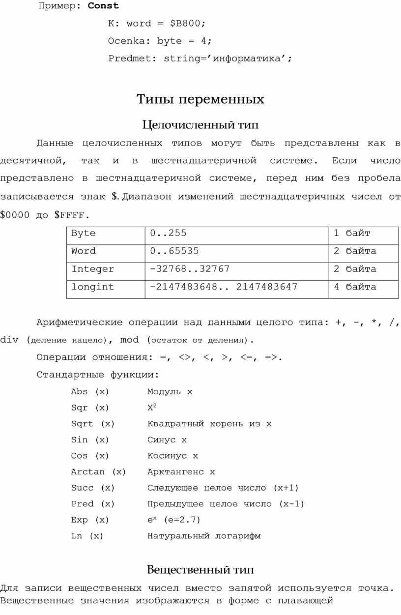 Данные целочисленных типов могут быть представлены как в десятичной, так и в шестнадцатеричной системе. Если число представлено в шестнадцатеричной системе, перед ним без пробела записывается знак $. Диапазон изменений шестнадцатеричных чисел от $0000 до $FFFF.