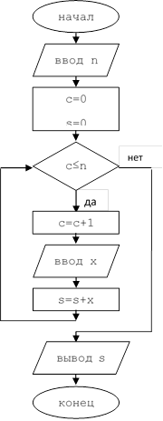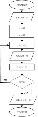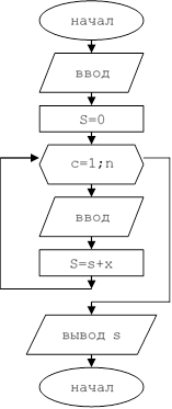 С – параметр цикла (подсчитывает количество вводимых чисел); n – количество чисел; x – вводимое число; S – сумма чисел.
