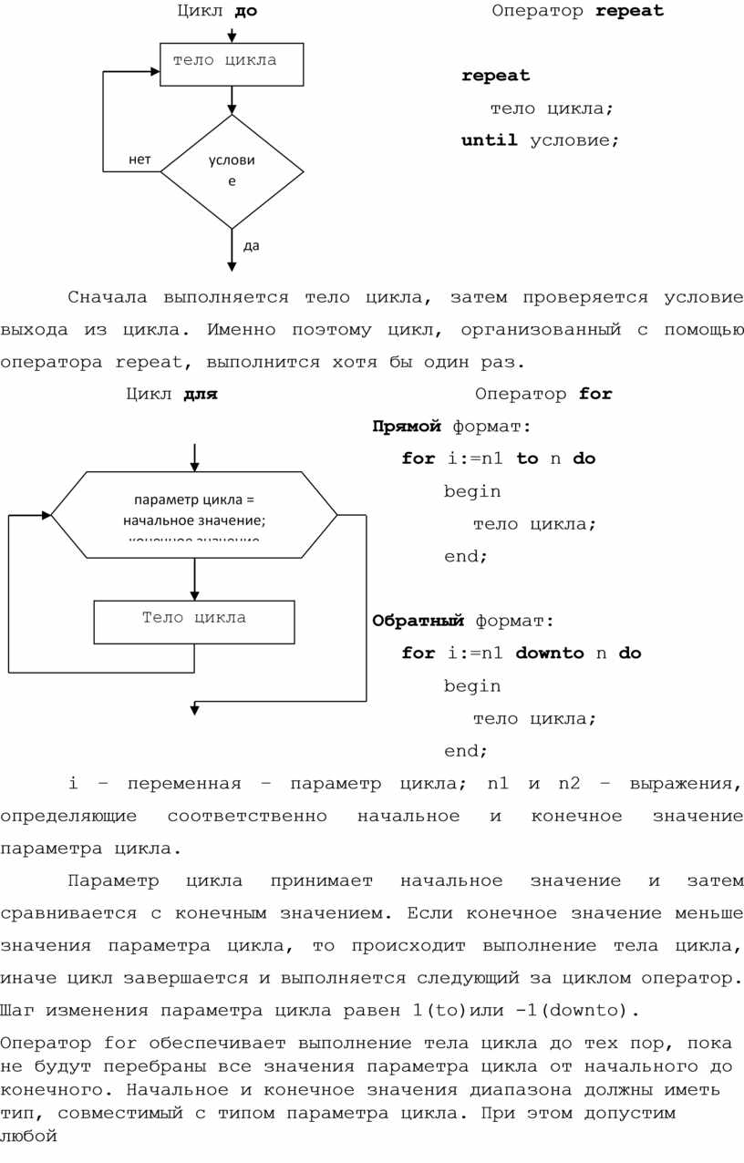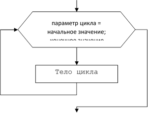 Параметр цикла принимает начальное значение и затем сравнивается с конечным значением. Если конечное значение меньше значения параметра цикла, то происходит выполнение тела цикла, иначе цикл завершается и выполняется следующий за циклом оператор. Шаг изменения параметра цикла равен 1(to)или -1(downto).