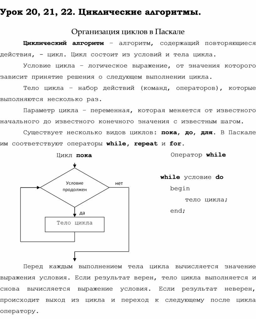 Существует несколько видов циклов: пока, до, для. В Паскале им соответствуют операторы while, repeat и for.