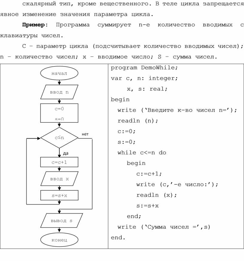 program DemoWhile; var c, n: integer; x, s: real; begin write (‘Введите к-во чисел n=’); readln (n); c:=0; s:=0; while c<=n do begin c:=c+1; write (c,’-е число:’); readln (x); s:=s+x end; write (‘Сумма чисел =’,s) end. |