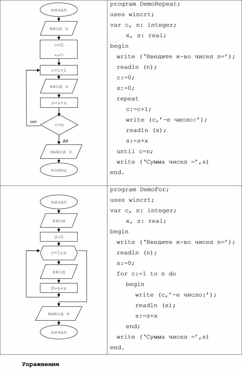program DemoRepeat; uses wincrt; var c, n: integer; x, s: real; begin write (‘Введите к-во чисел n=’); readln (n); c:=0; s:=0; repeat c:=c+1; write (c,’-е число:’); readln (x); s:=s+x until c=n; write (‘Сумма чисел =’,s) end. |