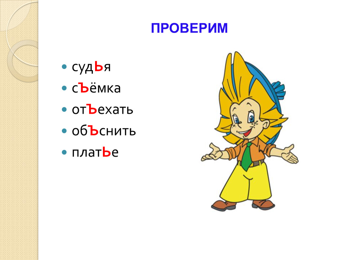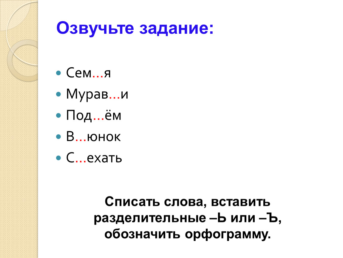 Списать слова, вставить разделительные –Ь или –Ъ, обозначить орфограмму.