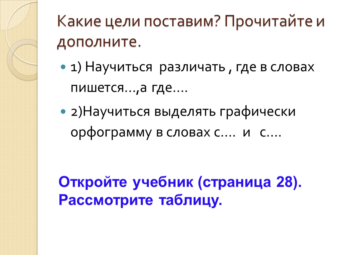 2)Научиться выделять графически орфограмму в словах с…. и с….