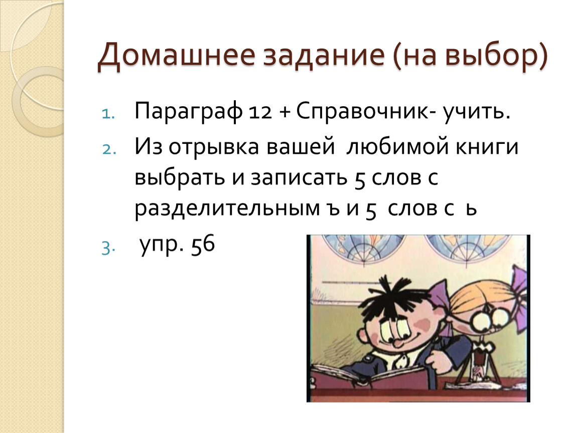Из отрывка вашей любимой книги выбрать и записать 5 слов с разделительным ъ и 5 слов с ь