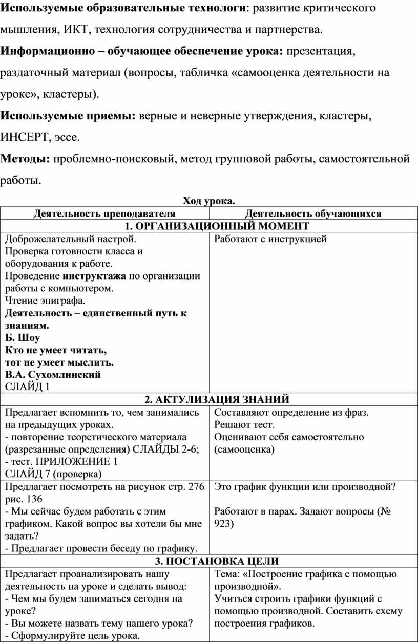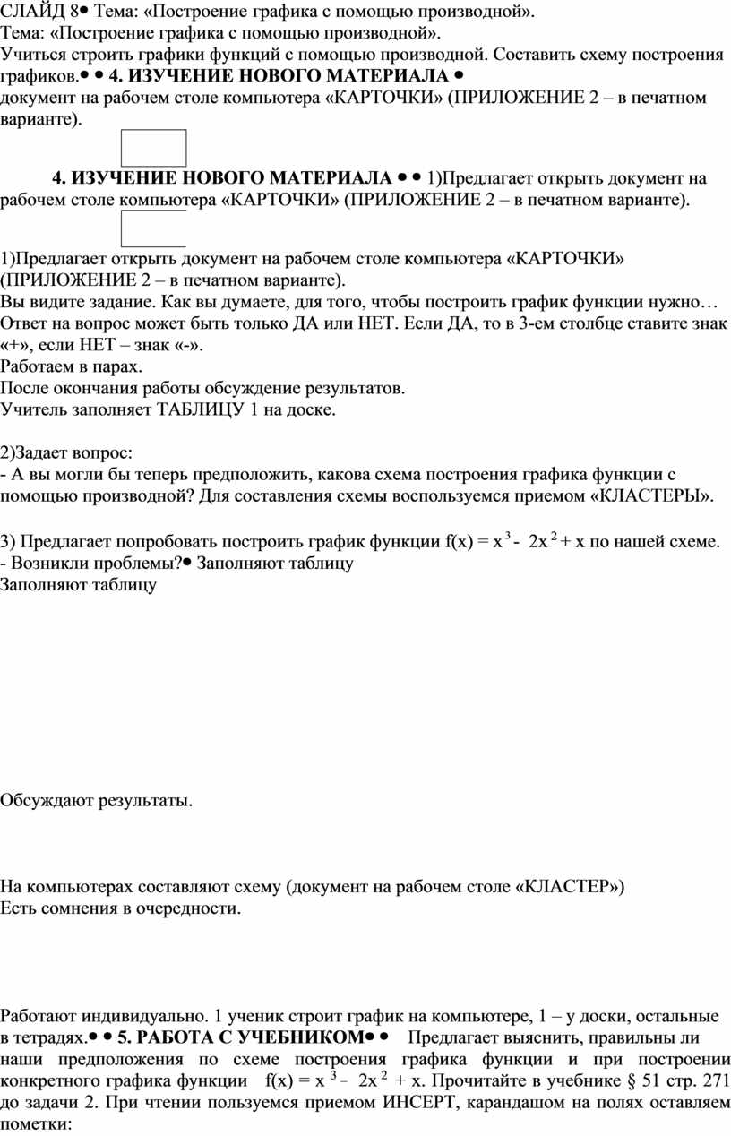 3)Сообщает, что результатом нашего урока будет написание эссе (в нашем случае – это схема построения графика с помощью производной. Выделить вопрос, который оказался непонятным или какой бы вы хотели задать учителю) |