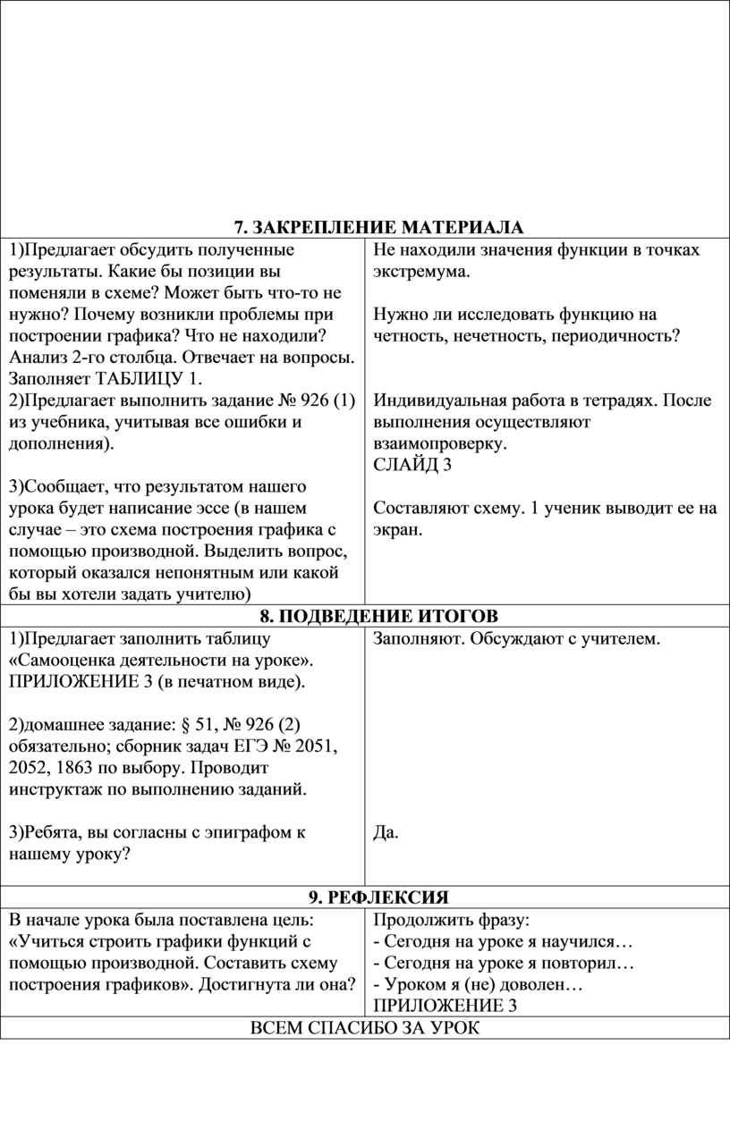 1)Предлагает обсудить полученные результаты. Какие бы позиции вы поменяли в схеме? Может быть что-то не нужно? Почему возникли проблемы при построении графика? Что не находили? Анализ 2-го столбца. Отвечает на вопросы. Заполняет ТАБЛИЦУ 1. 2)Предлагает выполнить задание № 926 (1) из учебника, учитывая все ошибки и дополнения).