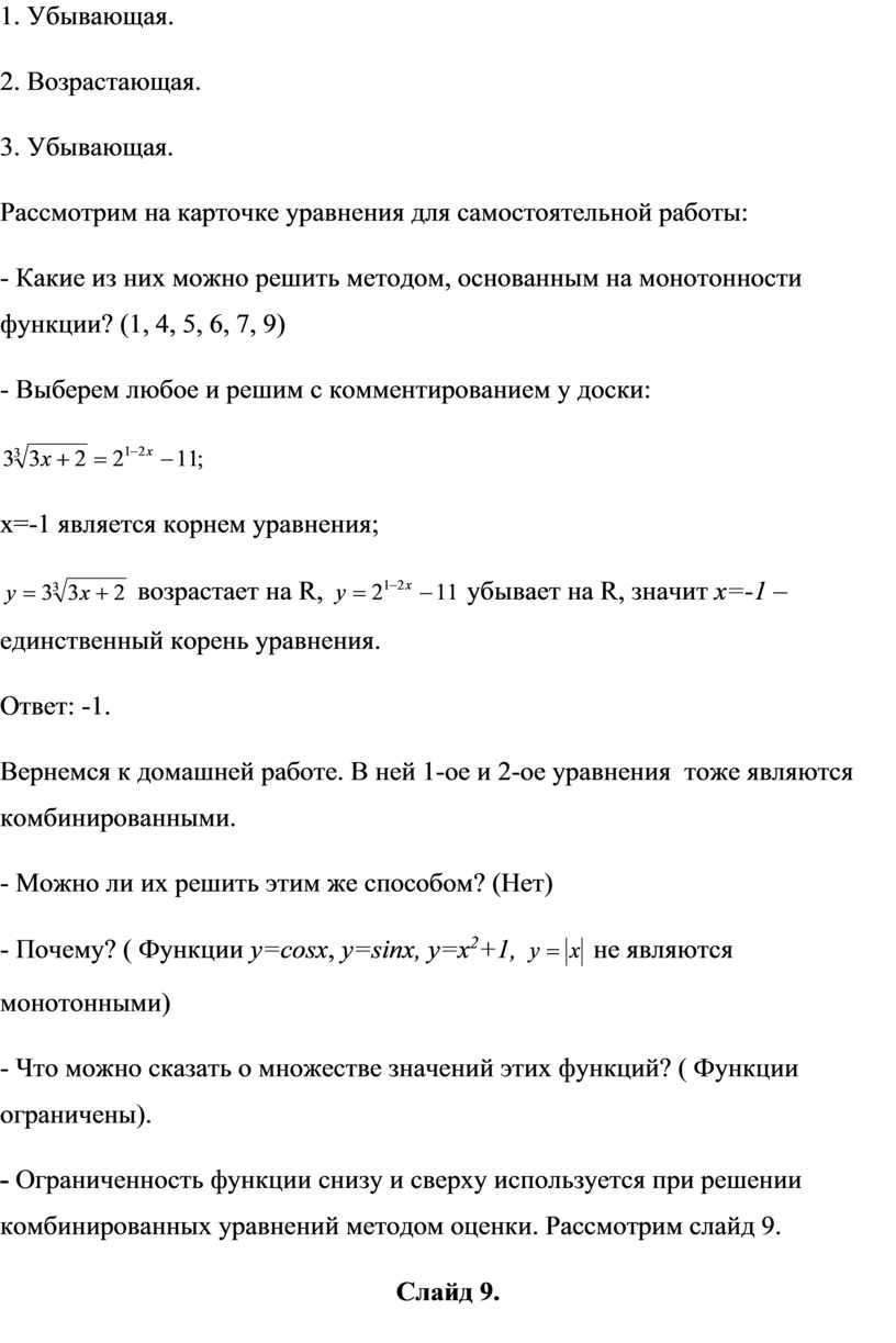 - Ограниченность функции снизу и сверху используется при решении комбинированных уравнений методом оценки. Рассмотрим слайд 9.