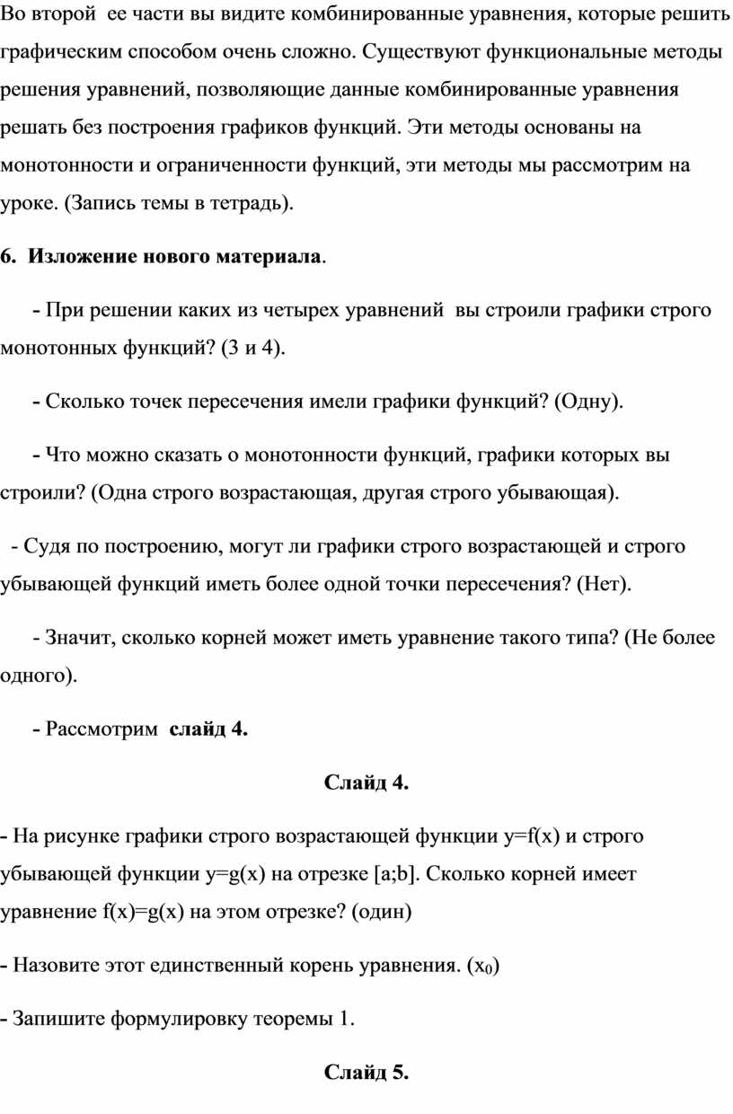 Во второй ее части вы видите комбинированные уравнения, которые решить графическим способом очень сложно. Существуют функциональные методы решения уравнений, позволяющие данные комбинированные уравнения решать без построения графиков функций. Эти методы основаны на монотонности и ограниченности функций, эти методы мы рассмотрим на уроке. (Запись темы в тетрадь).