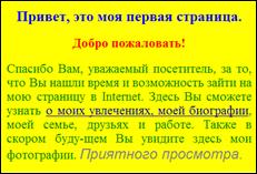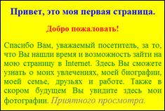 <font color=green>Спасибо Вам, уважаемый посетитель, за то, что Вы нашли время и возможность зайти на мою страницу в Internet. Здесь Вы сможете узнать о моих увлечениях, моей биографии, моей семье, друзьях и работе. Также в скором будущем Вы увидите здесь мои фотографии. <font size=+1 color=green><i> Приятного просмотра.</i> </font> </font>