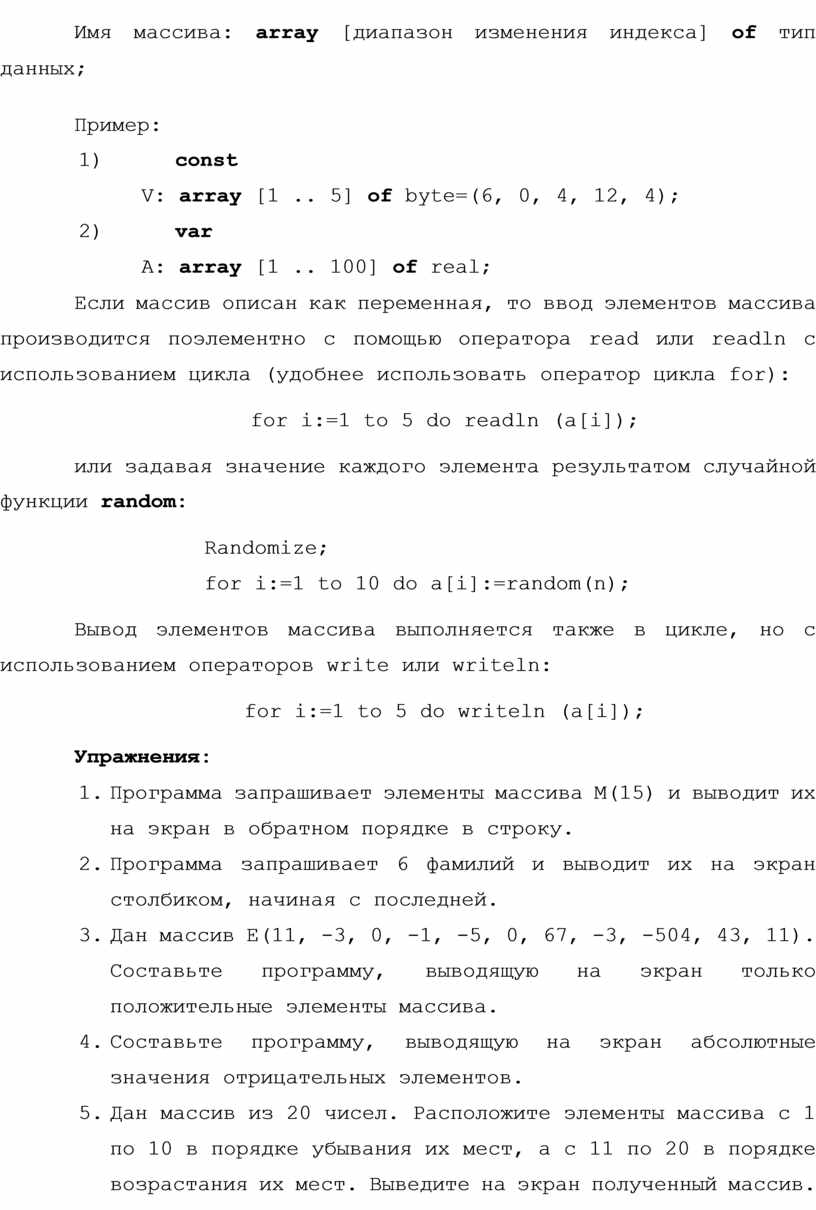 Если массив описан как переменная, то ввод элементов массива производится поэлементно с помощью оператора read или readln с использованием цикла (удобнее использовать оператор цикла for):