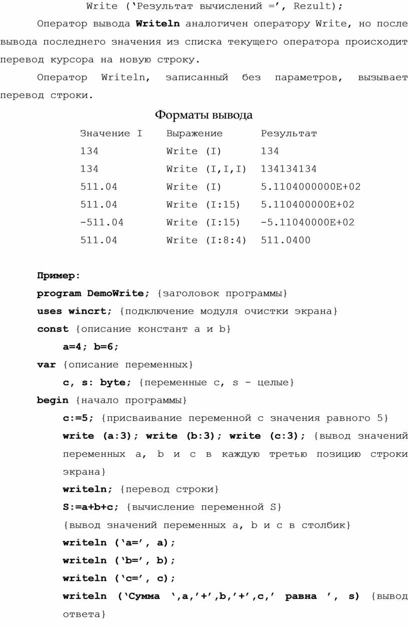 Вывод данных на экран обеспечивает оператор Write (писать). Оператор может выводить значения констант, значения переменных, значения арифметических выражений, заключенные в апострофы тексты и символы, всевозможные комбинации из вышеперечисленного списка.