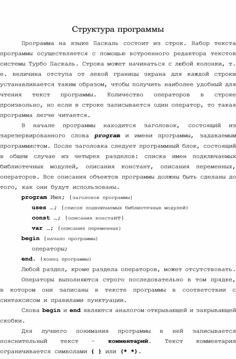Программа на языке Паскаль состоит из строк. Набор текста программы осуществляется с помощью встроенного редактора текстов системы Турбо Паскаль. Строка может начинаться с любой колонки, т. е. величина отступа от левой границы экрана для каждой строки устанавливается таким образом, чтобы получить наиболее удобный для чтения текст программы. Количество операторов в строке произвольно, но если в строке записывается один оператор, то такая программа легче читается.