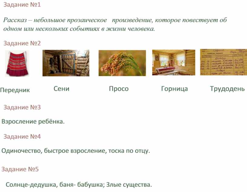 Солнце-дедушка, баня- бабушка; Злые существа.