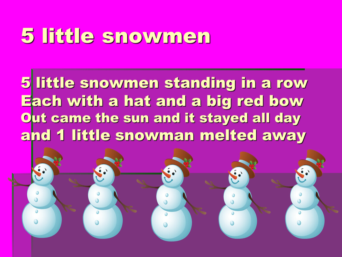 5 little snowmen5 little snowmen standing in a rowEach with a hat and a big red bowOut came the sun and it stayed all dayand 1 little snowman melted away