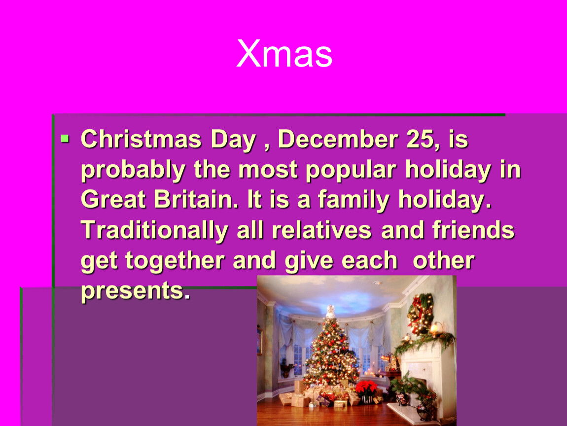 Christmas Day , December 25, is probably the most popular holiday in Great Britain. It is a family holiday. Traditionally all relatives and friends get together and give each other presents.