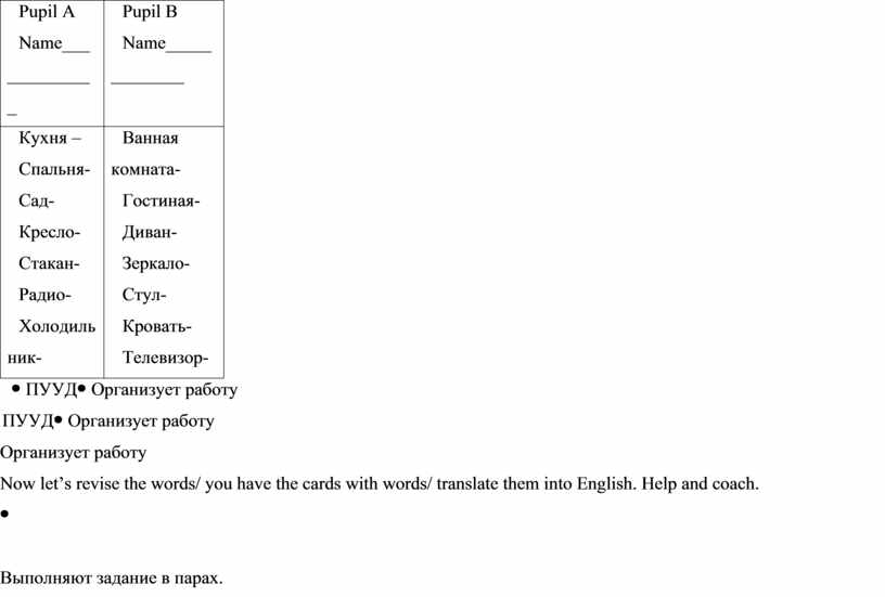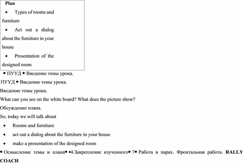 Работа в парах. Фронтальная работа. RALLY COACH Детям раздается таблица со словами в две колонки: различные комнаты и мебель. Задача учащихся перевести слова с русского на английский. Вначале идет работа в парах, затем проверка происходит у доски.
