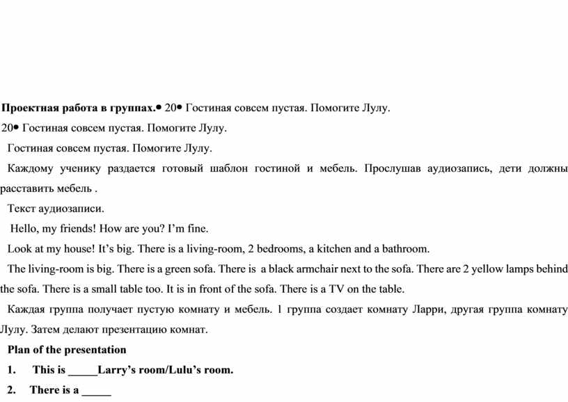 Гостиная совсем пустая. Помогите Лулу. Каждому ученику раздается готовый шаблон гостиной и мебель. Прослушав аудиозапись, дети должны расставить мебель . Текст аудиозаписи. Hello, my friends! How are you? I’m fine. Look at my house! It’s big. There is a living-room, 2 bedrooms, a kitchen and a bathroom. The living-room is big. There is a green sofa. There is a black armchair next to the sofa. There are 2 yellow lamps behind the sofa. There is a small table too. It is in front of the sofa. There is a TV on the table. Каждая группа получает пустую комнату и мебель. 1 группа создает комнату Ларри, другая группа комнату Лулу. Затем делают презентацию комнат. Plan of the presentation 1. This is _____Larry’s room/Lulu’s room. 2. There is a _____ 3. There are______ 4. There is a-________next to/ on/ behind- the_____ |