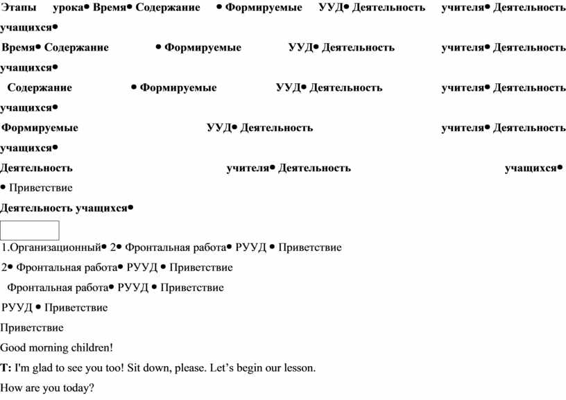 Приветствие Good morning children! T: I'm glad to see you too! Sit down, please. Let’s begin our lesson. How are you today?