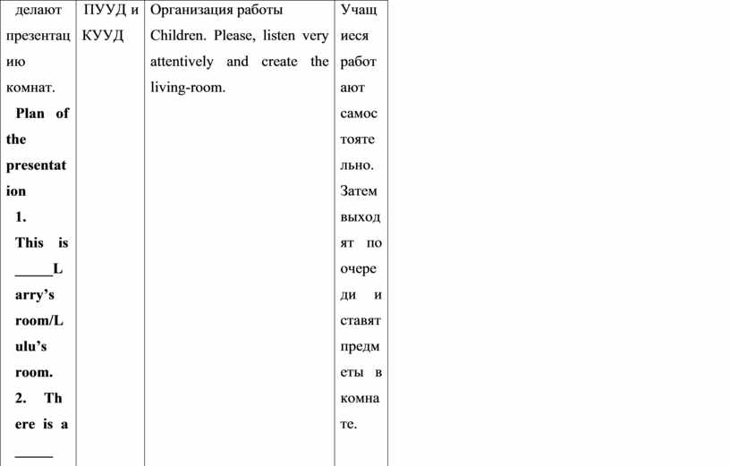 Организация работы Children. Please, listen very attentively and create the living-room.