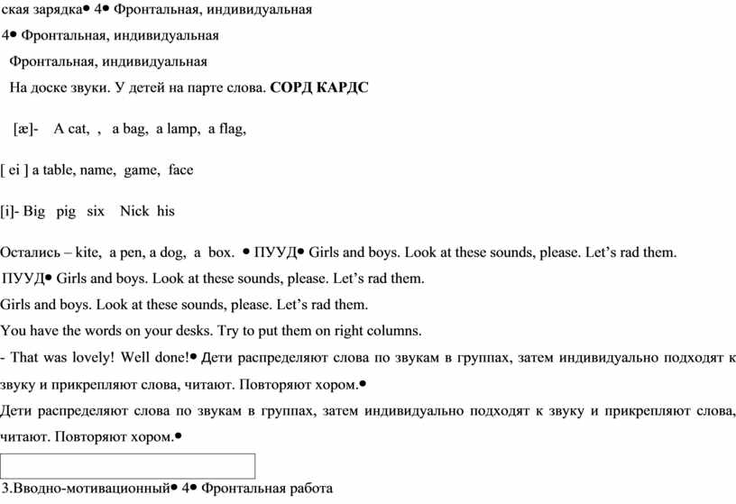 Фронтальная, индивидуальная На доске звуки. У детей на парте слова. СОРД КАРДС [æ]- A cat, , a bag, a lamp, a flag, [ ei ] a table, name, game, face [i]- Big pig six Nick his Остались – kite, а pen, a dog, a box. |