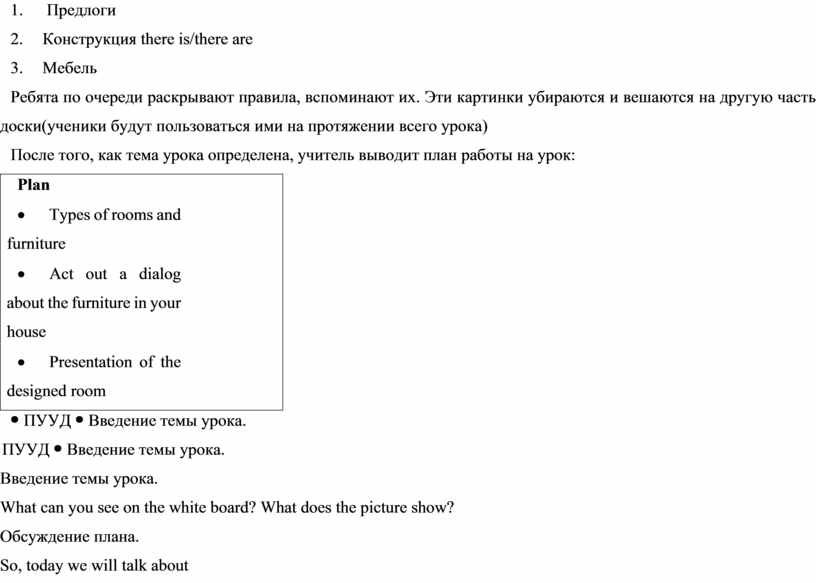 Введение темы урока. What can you see on the white board? What does the picture show? Обсуждение плана. So, today we will talk about · Rooms and furniture · act out a dialog about the furniture in your house · make a presentation of the designed room
