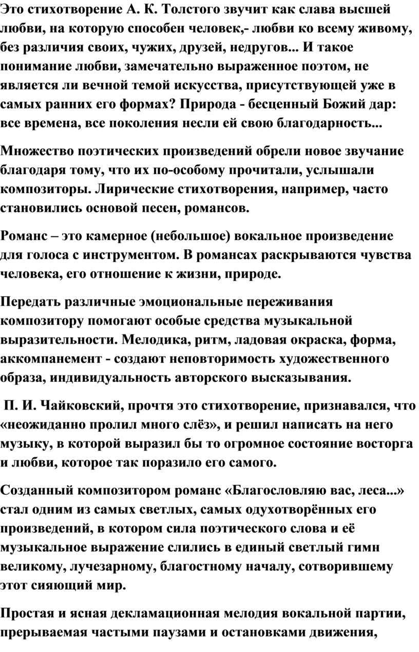 1. Знакомо ли вам состояние, выраженное в стихотворении А. К. Толстого «Благословляю вас, леса...» и одноименном романсе П. И. Чайковского?
