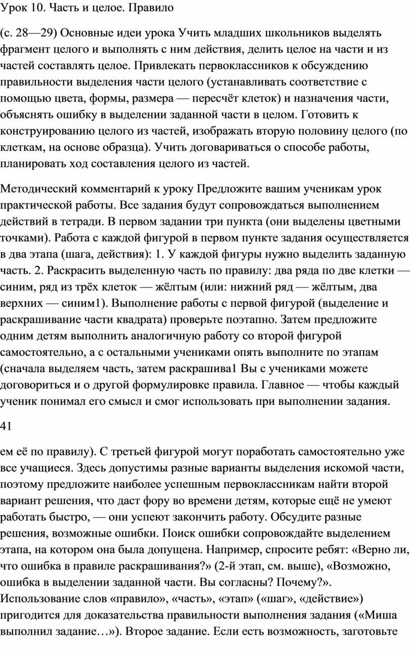 (с. 28—29) Основные идеи урока Учить младших школьников выделять фрагмент целого и выполнять с ним действия, делить целое на части и из частей составлять целое. Привлекать первоклассников к обсуждению правильности выделения части целого (устанавливать соответствие с помощью цвета, формы, размера — пересчёт клеток) и назначения части, объяснять ошибку в выделении заданной части в целом. Готовить к конструированию целого из частей, изображать вторую половину целого (по клеткам, на основе образца). Учить договариваться о способе работы, планировать ход составления целого из частей.