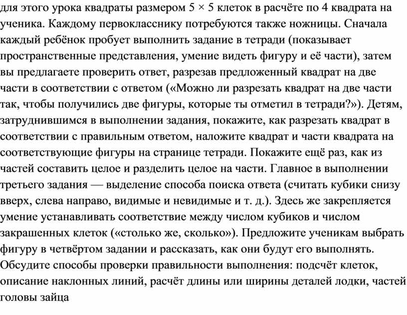 ем её по правилу). С третьей фигурой могут поработать самостоятельно уже все учащиеся. Здесь допустимы разные варианты выделения искомой части, поэтому предложите наиболее успешным первоклассникам найти второй вариант решения, что даст фору во времени детям, которые ещё не умеют работать быстро, — они успеют закончить работу. Обсудите разные решения, возможные ошибки. Поиск ошибки сопровождайте выделением этапа, на котором она была допущена. Например, спросите ребят: «Верно ли, что ошибка в правиле раскрашивания?» (2-й этап, см. выше), «Возможно, ошибка в выделении заданной части. Вы согласны? Почему?». Использование слов «правило», «часть», «этап» («шаг», «действие») пригодится для доказательства правильности выполнения задания («Миша выполнил задание…»). Второе задание. Если есть возможность, заготовьте для этого урока квадраты размером 5 × 5 клеток в расчёте по 4 квадрата на ученика. Каждому первокласснику потребуются также ножницы. Сначала каждый ребёнок пробует выполнить задание в тетради (показывает пространственные представления, умение видеть фигуру и её части), затем вы предлагаете проверить ответ, разрезав предложенный квадрат на две части в соответствии с ответом («Можно ли разрезать квадрат на две части так, чтобы получились две фигуры, которые ты отметил в тетради?»). Детям, затруднившимся в выполнении задания, покажите, как разрезать квадрат в соответствии с правильным ответом, наложите квадрат и части квадрата на соответствующие фигуры на странице тетради. Покажите ещё раз, как из частей составить целое и разделить целое на части. Главное в выполнении третьего задания — выделение способа поиска ответа (считать кубики снизу вверх, слева направо, видимые и невидимые и т. д.). Здесь же закрепляется умение устанавливать соответствие между числом кубиков и числом закрашенных клеток («столько же, сколько»). Предложите ученикам выбрать фигуру в четвёртом задании и рассказать, как они будут его выполнять. Обсудите способы проверки правильности выполнения: подсчёт клеток, описание наклонных линий, расчёт длины или ширины деталей лодки, частей головы зайца