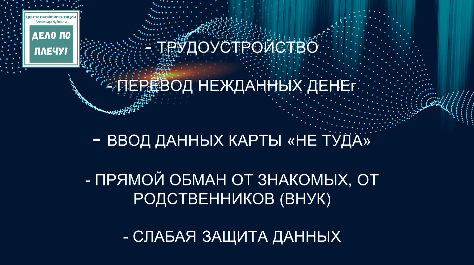 - ТРУДОУСТРОЙСТВО - ПЕРЕВОД НЕЖДАННЫХ ДЕНЕг - ВВОД ДАННЫХ КАРТЫ «НЕ ТУДА» - ПРЯМОЙ ОБМАН ОТ ЗНАКОМЫХ, ОТ РОДСТВЕННИКОВ (ВНУК) - СЛАБАЯ ЗАЩИТА ДАННЫХ