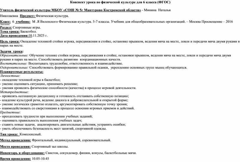 Конспект урока по физической культуре для 6 класса (ФГОС)