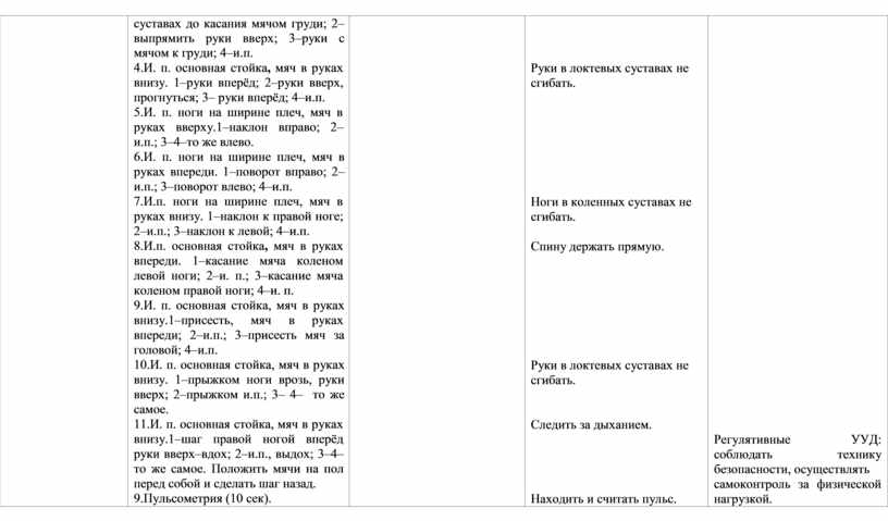 суставах до касания мячом груди; 2– выпрямить руки вверх; 3–руки с мячом к груди; 4–и.п. 4.И. п. основная стойка, мяч в руках внизу. 1–руки вперёд; 2–руки вверх, прогнуться; 3– руки вперёд; 4–и.п. 5.И. п. ноги на ширине плеч, мяч в руках вверху.1–наклон вправо; 2– и.п.; 3–4–то же влево. 6.И. п. ноги на ширине плеч, мяч в руках впереди. 1–поворот вправо; 2– и.п.; 3–поворот влево; 4–и.п. 7.И.п. ноги на ширине плеч, мяч в руках внизу. 1–наклон к правой ноге; 2–и.п.; 3–наклон к левой; 4–и.п. 8.И.п. основная стойка, мяч в руках впереди. 1–касание мяча коленом левой ноги; 2–и. п.; 3–касание мяча коленом правой ноги; 4–и. п. 9.И. п. основная стойка, мяч в руках внизу.1–присесть, мяч в руках впереди; 2–и.п.; 3–присесть мяч за головой; 4–и.п. 10.И. п. основная стойка, мяч в руках внизу. 1–прыжком ноги врозь, руки вверх; 2–прыжком и.п.; 3– 4– то же самое. 11.И. п. основная стойка, мяч в руках внизу.1–шаг правой ногой вперёд руки вверх–вдох; 2–и.п., выдох; 3–4– то же самое. Положить мячи на пол перед собой и сделать шаг назад. 9.Пульсометрия (10 сек). |