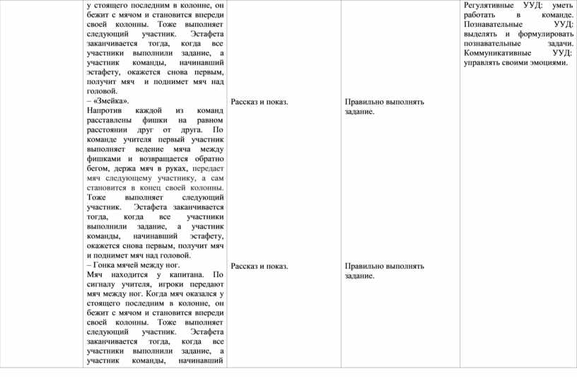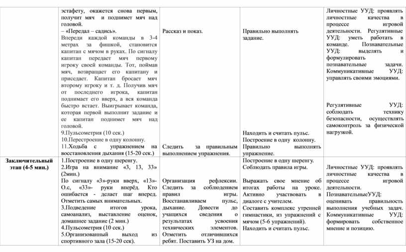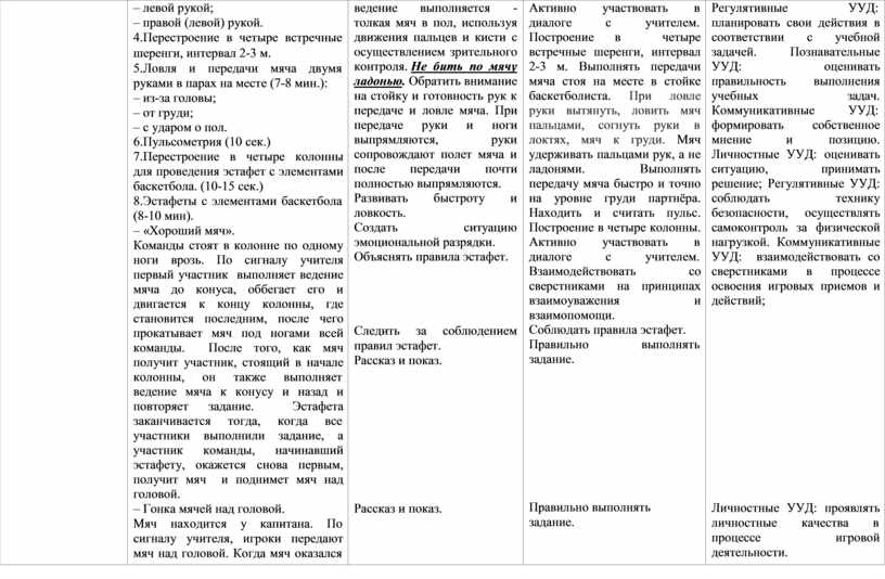 Активно участвовать в диалоге с учителем. Построение в четыре встречные шеренги, интервал 2-3 м. Выполнять передачи мяча стоя на месте в стойке баскетболиста. При ловле руки вытянуть, ловить мяч пальцами, согнуть руки в локтях, мяч к груди. Мяч удерживать пальцами рук, а не ладонями. Выполнять передачу мяча быстро и точно на уровне груди партнёра. Находить и считать пульс. Построение в четыре колонны. Активно участвовать в диалоге с учителем. Взаимодействовать со сверстниками на принципах взаимоуважения и взаимопомощи. Соблюдать правила эстафет. Правильно выполнять задание.