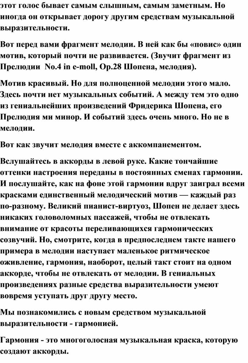 Мелодия — это только один из множества элементов музыкального языка, только один музыкальный голос. Часто этот голос бывает самым слышным, самым заметным. Но иногда он открывает дорогу другим средствам музыкальной выразительности.
