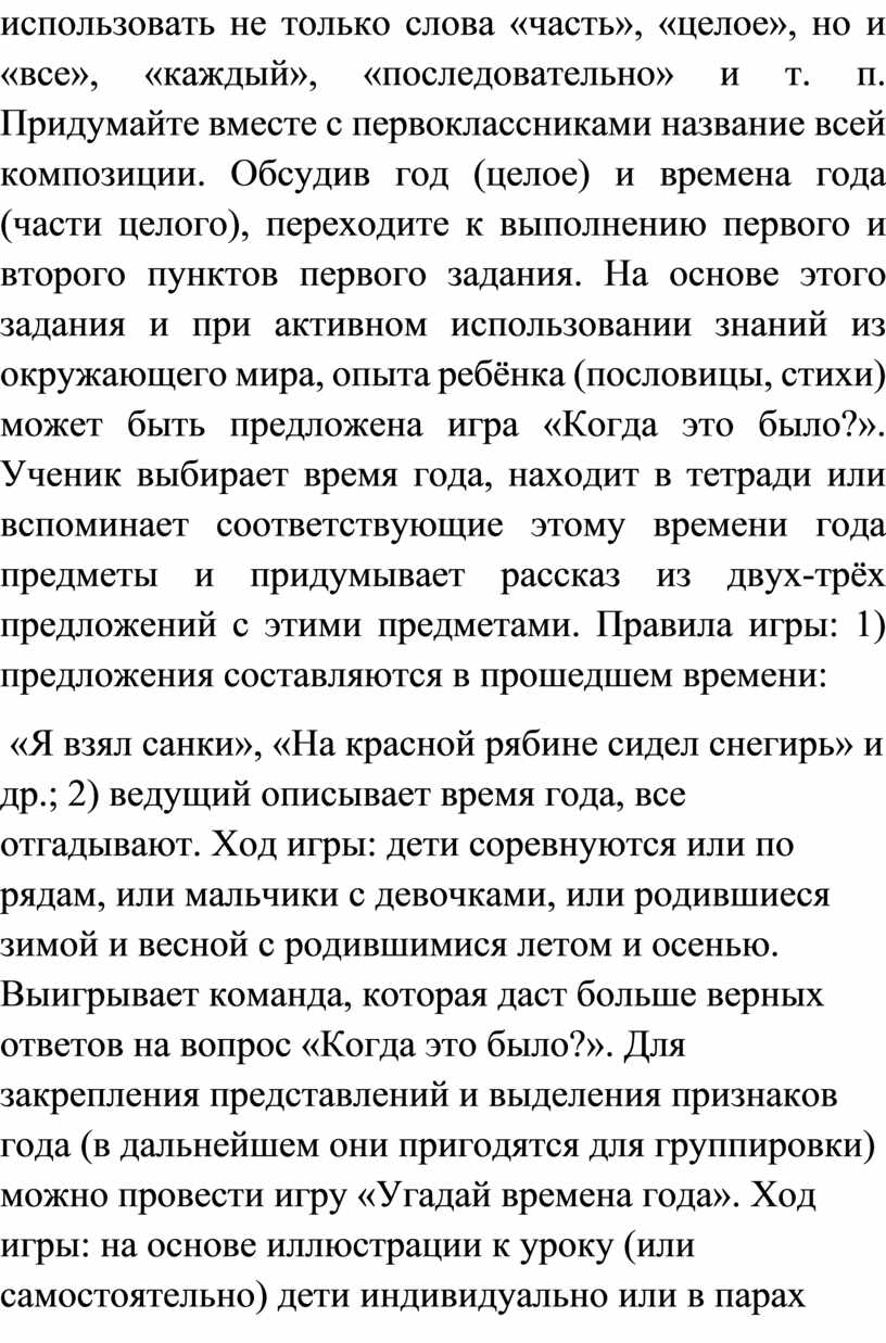 Прежде чем ученики начнут рассматривать иллюстрацию в рабочей тетради, задайте им вопросы: «Что объединяет все картинки? Что здесь можно назвать словом “целое”, а что словом “часть”». Когда приступите к обсуждению, предлагайте детям использовать не только слова «часть», «целое», но и «все», «каждый», «последовательно» и т. п. Придумайте вместе с первоклассниками название всей композиции. Обсудив год (целое) и времена года (части целого), переходите к выполнению первого и второго пунктов первого задания. На основе этого задания и при активном использовании знаний из окружающего мира, опыта ребёнка (пословицы, стихи) может быть предложена игра «Когда это было?». Ученик выбирает время года, находит в тетради или вспоминает соответствующие этому времени года предметы и придумывает рассказ из двух-трёх предложений с этими предметами. Правила игры: 1) предложения составляются в прошедшем времени: