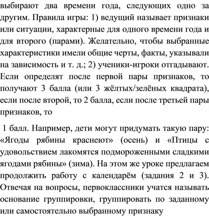 «Я взял санки», «На красной рябине сидел снегирь» и др.; 2) ведущий описывает время года, все отгадывают. Ход игры: дети соревнуются или по рядам, или мальчики с девочками, или родившиеся зимой и весной с родившимися летом и осенью. Выигрывает команда, которая даст больше верных ответов на вопрос «Когда это было?». Для закрепления представлений и выделения признаков года (в дальнейшем они пригодятся для группировки) можно провести игру «Угадай времена года». Ход игры: на основе иллюстрации к уроку (или самостоятельно) дети индивидуально или в парах выбирают два времени года, следующих одно за другим. Правила игры: 1) ведущий называет признаки или ситуации, характерные для одного времени года и для второго (парами). Желательно, чтобы выбранные характеристики имели общие черты, факты, указывали на зависимость и т. д.; 2) ученики-игроки отгадывают. Если определят после первой пары признаков, то получают 3 балла (или 3 жёлтых/зелёных квадрата), если после второй, то 2 балла, если после третьей пары признаков, то