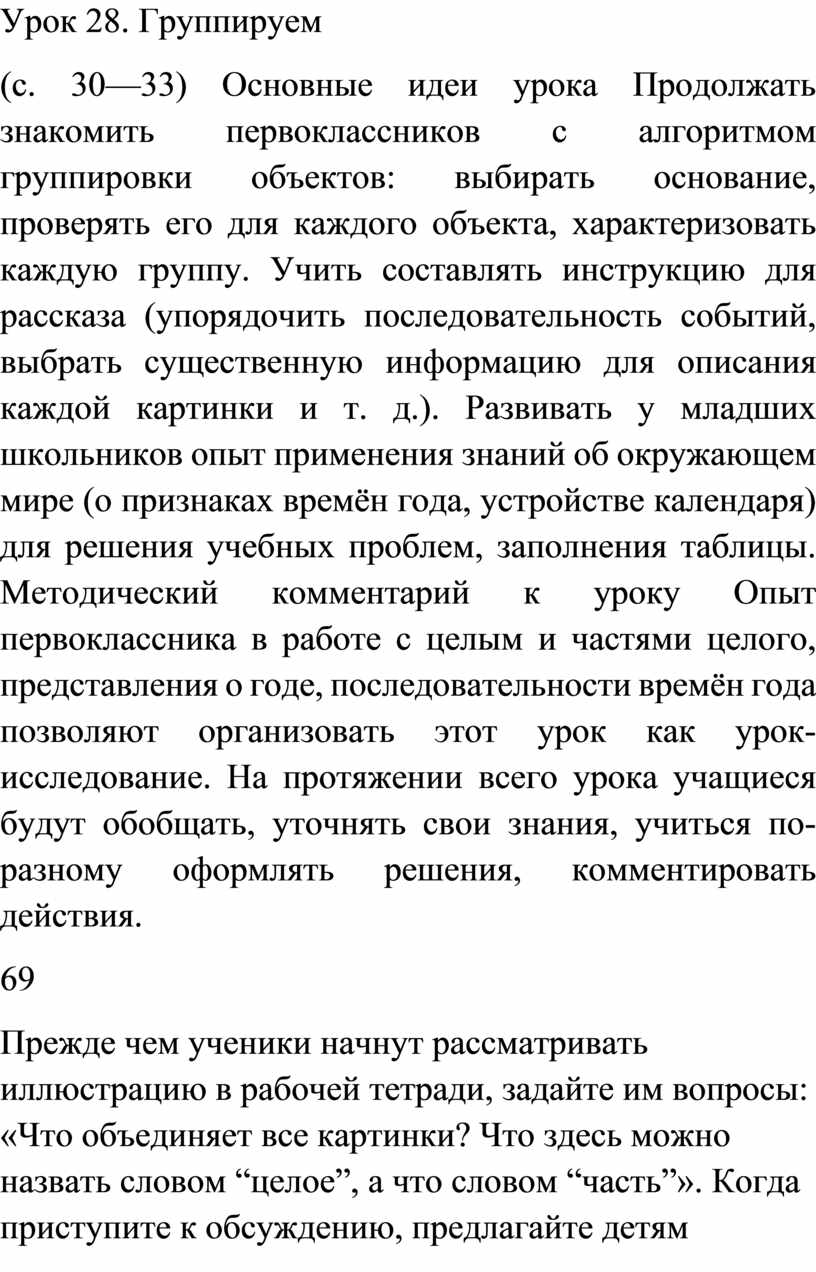 (с. 30—33) Основные идеи урока Продолжать знакомить первоклассников с алгоритмом группировки объектов: выбирать основание, проверять его для каждого объекта, характеризовать каждую группу. Учить составлять инструкцию для рассказа (упорядочить последовательность событий, выбрать существенную информацию для описания каждой картинки и т. д.). Развивать у младших школьников опыт применения знаний об окружающем мире (о признаках времён года, устройстве календаря) для решения учебных проблем, заполнения таблицы. Методический комментарий к уроку Опыт первоклассника в работе с целым и частями целого, представления о годе, последовательности времён года позволяют организовать этот урок как урок-исследование. На протяжении всего урока учащиеся будут обобщать, уточнять свои знания, учиться по-разному оформлять решения, комментировать действия.