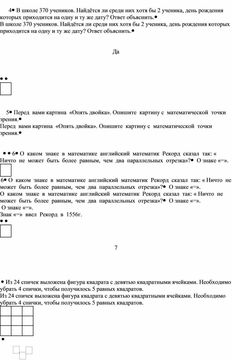 В школе 370 учеников. Найдётся ли среди них хотя бы 2 ученика, день рождения которых приходится на одну и ту же дату? Ответ объяснить. |