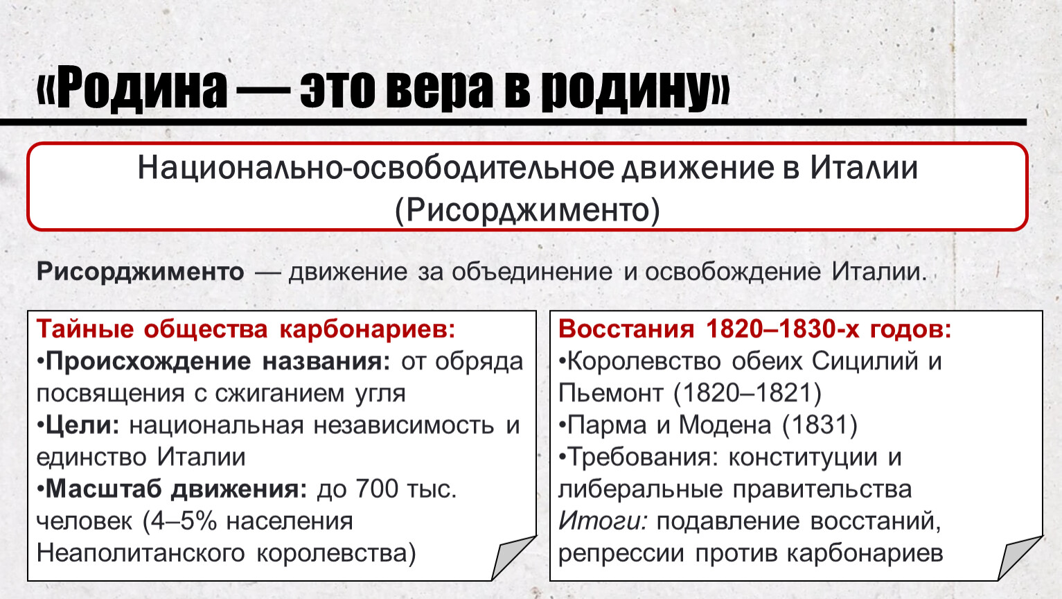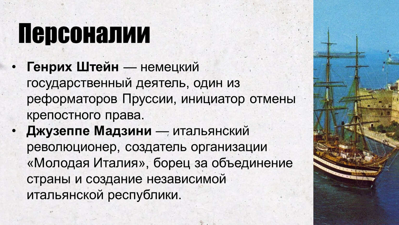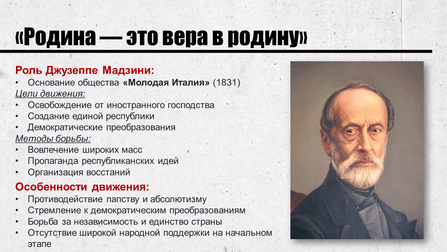 Джузеппе Мадзини — итальянский революционер, создатель организации «Молодая Италия», борец за объединение страны и создание независимой итальянской республики.