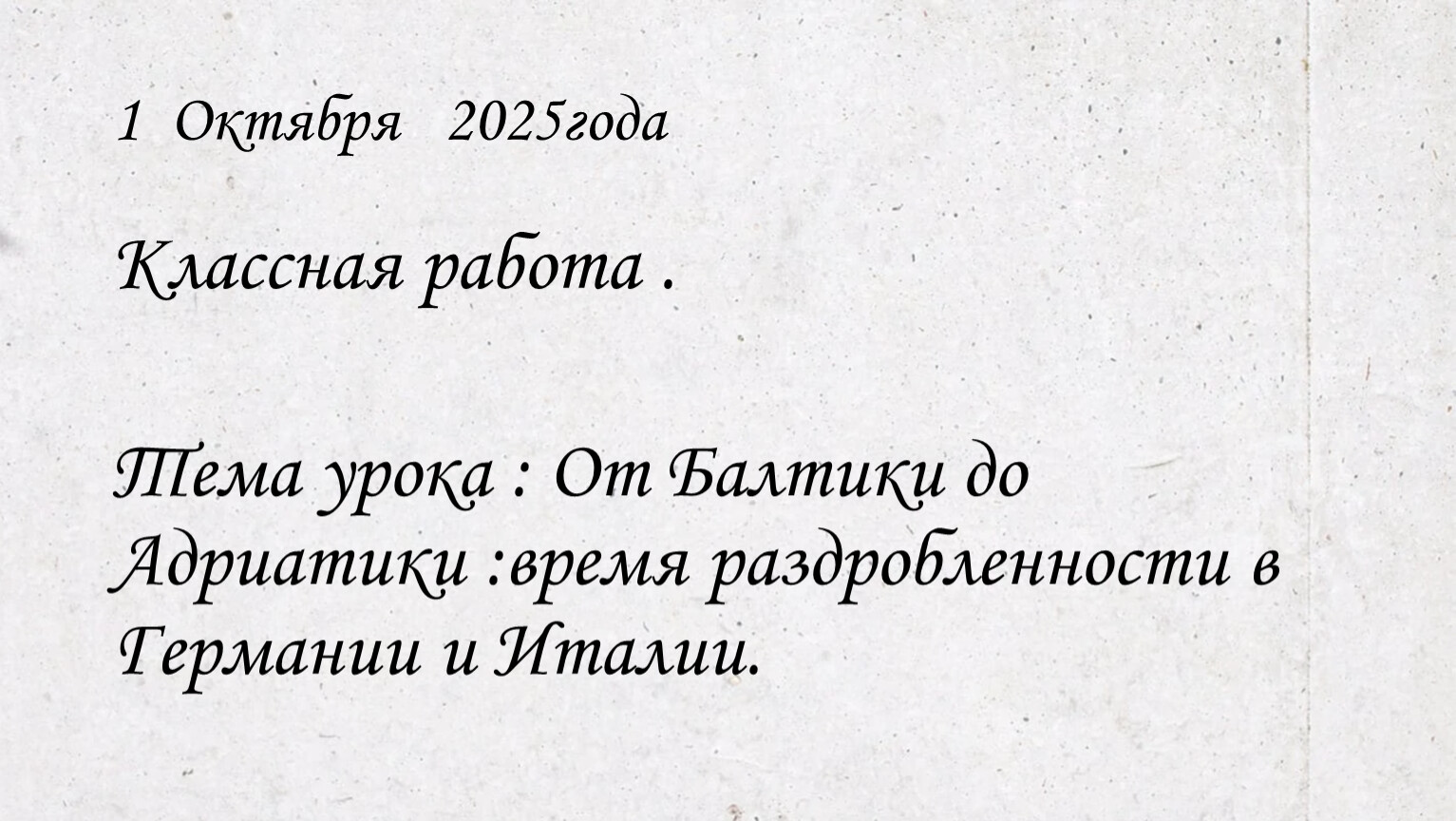 Тема урока : От Балтики до Адриатики :время раздробленности в Германии и Италии.