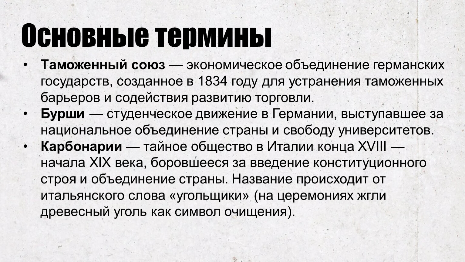 Таможенный союз — экономическое объединение германских государств, созданное в 1834 году для устранения таможенных барьеров и содействия развитию торговли.