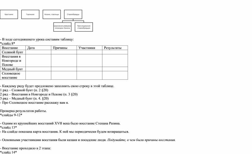 - Каждому ряду будет предложено заполнить свою строку в этой таблице. 1 ряд – Соляной бунт (п. 2 §20) 2 ряд – Восстания в Новгороде и Пскове (п. 3 §20) 3 ряд – Медный бунт (п. 4. §20) - Про Соловецкое восстание расскажу вам я.